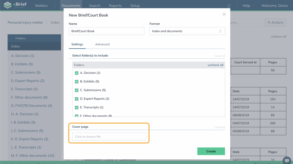 During bundle creation, include the affidavit document in the “Cover Page” section.