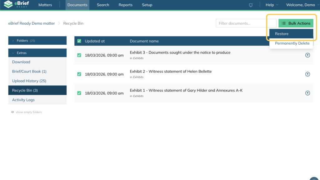 - Restore multiple documents by selecting them, then choosing Bulk actions and clicking Restore.